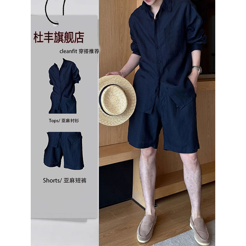 Old money style linen casual suit men's summer thin lazy loose shirt cleanfit outfit complete set