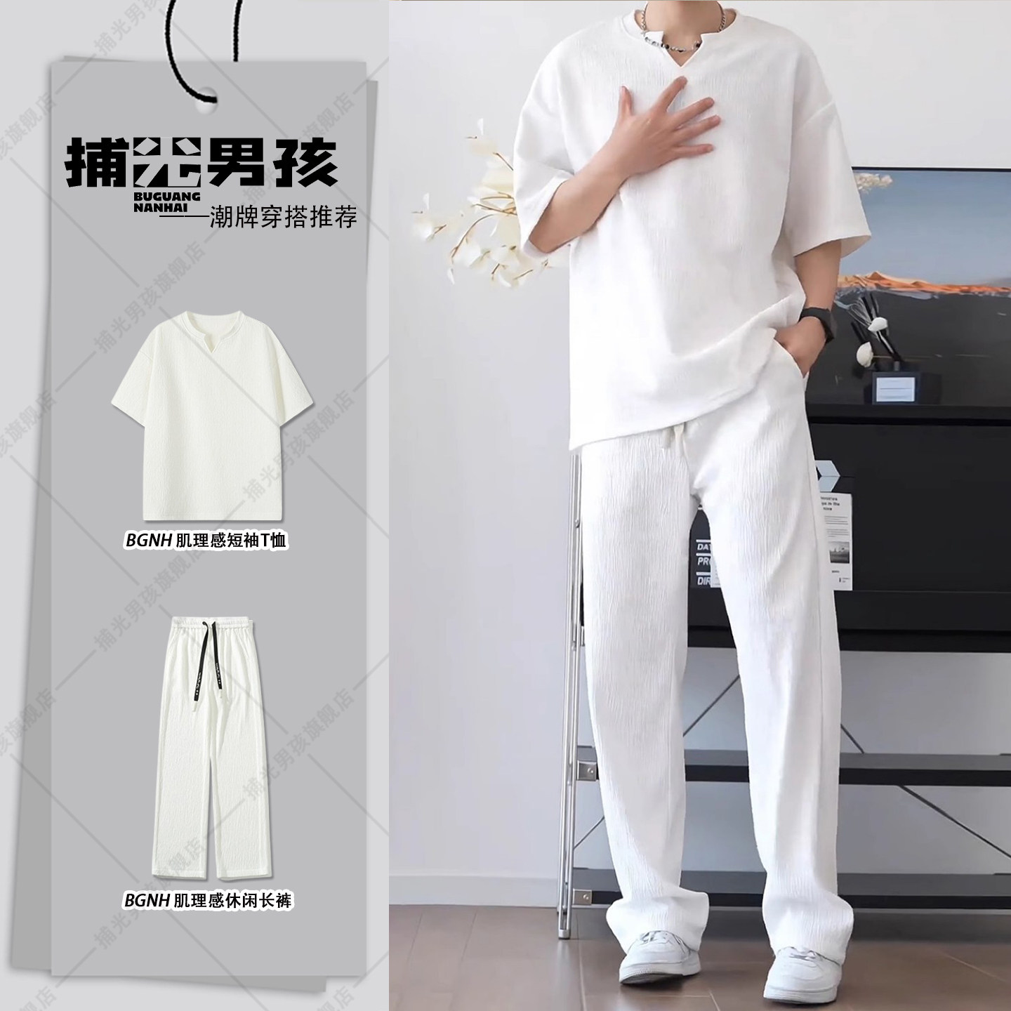 Summer texture ice silk quick-drying short-sleeved T-shirt suit men's drape high-end casual pants two-piece matching
