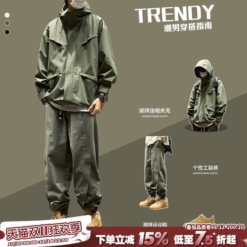 Set men's spring and autumn American casual outdoor outfit, a set of 2025 new jacket with functional cargo pants