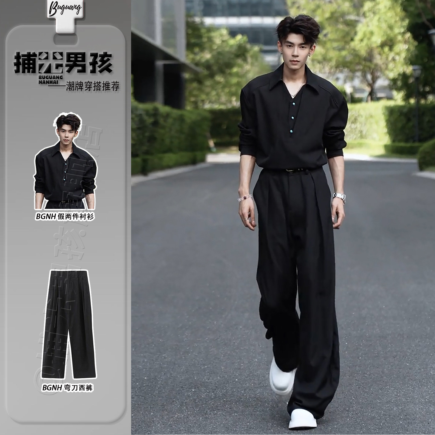 Autumn ootd wears a complete set of men's clothing, fake two-piece shoulder pads, V-neck shirt, British yuppie drapes, suit pants