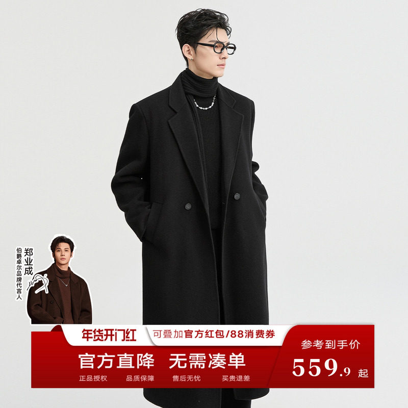 Autumn and winter wool reversible dweed coat, men's shoulder pads, over-the-knee suit collar, Korean woolen trench coat