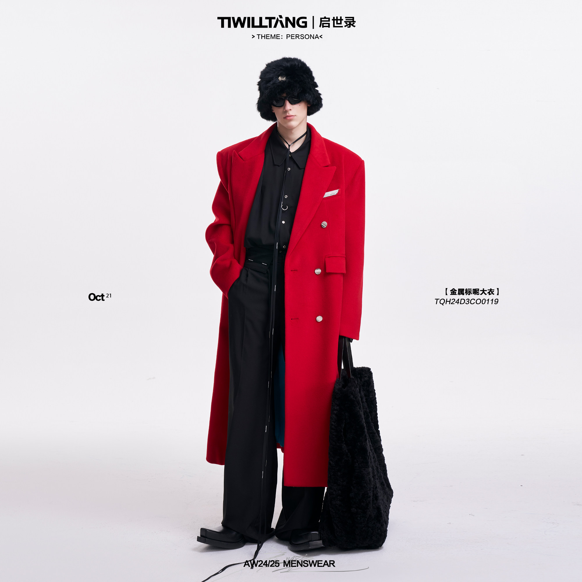 Qishilu TIWILLTANG "Wind Rolling Mountain Lan" metal label red mid-length autumn and winter woolen coat jacket for men