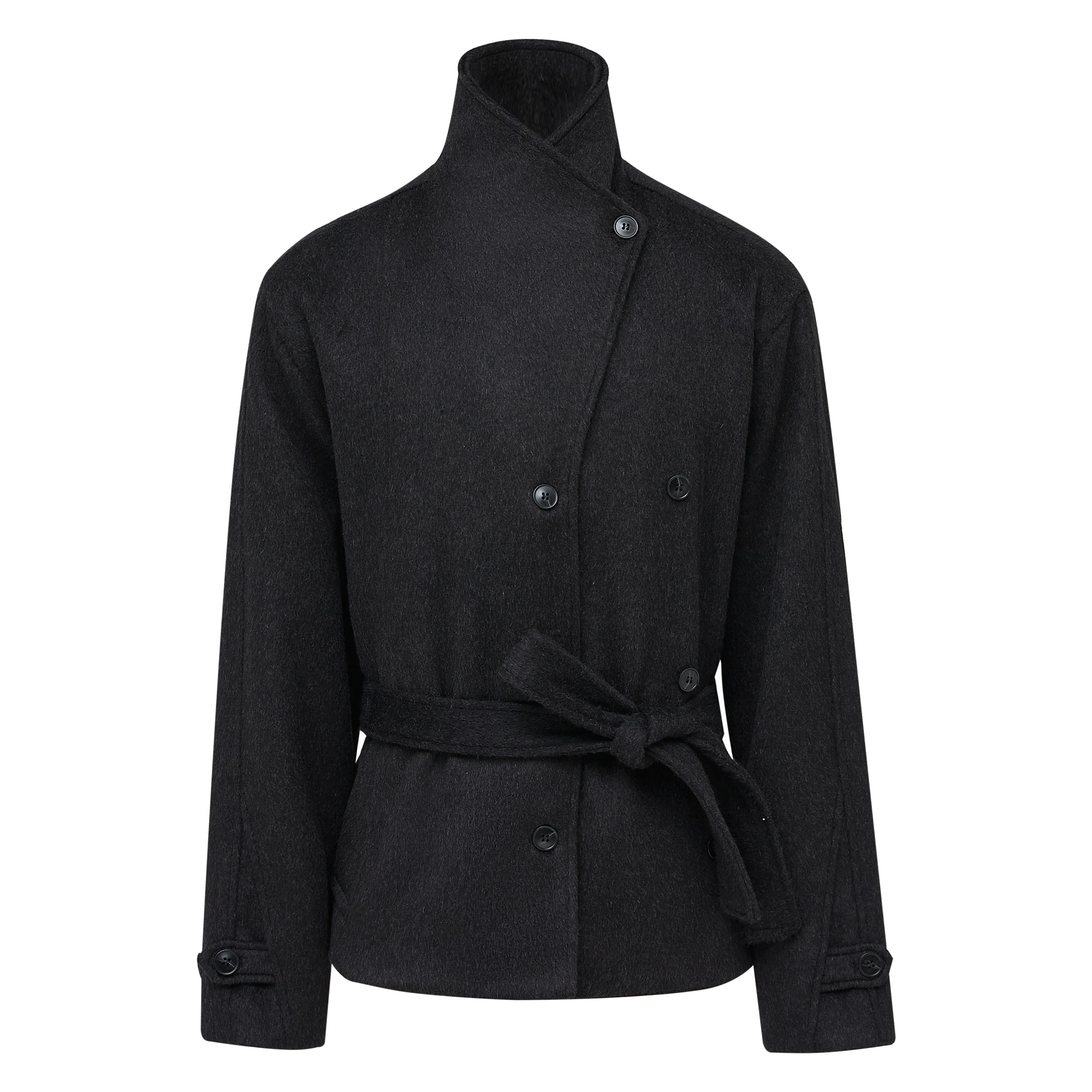 HARH "Midnight in Paris" original buttonless black faux cashmere long woolen jacket with shoulder pads and woolen coat