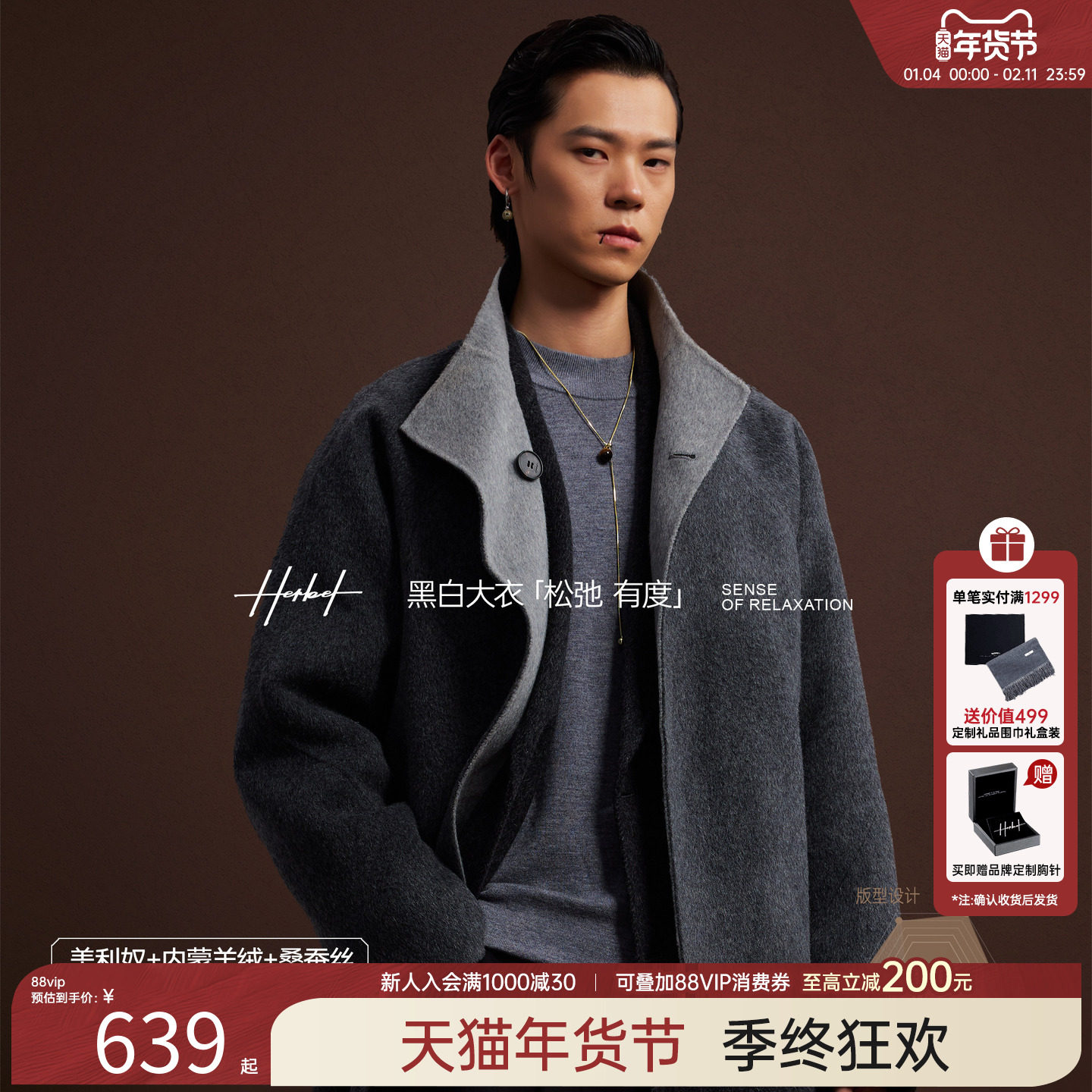 HERBEL/Black & White Wool Coat Men's Winter 2025 Black Label Cashmere Reversible Cashmere Coat Jacket