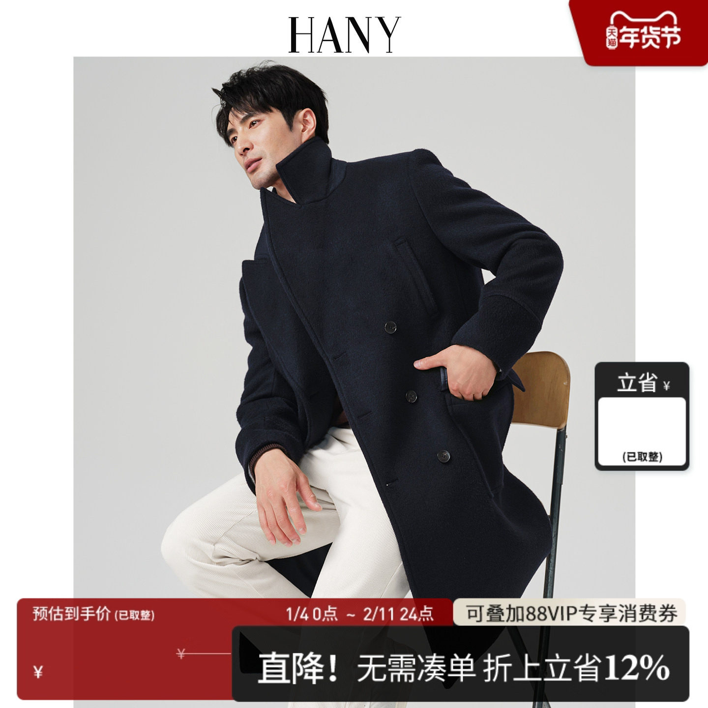 HANY [super thick camel fleece navy coat] men's new mulberry silk wool wool double-breasted jacket autumn and winter