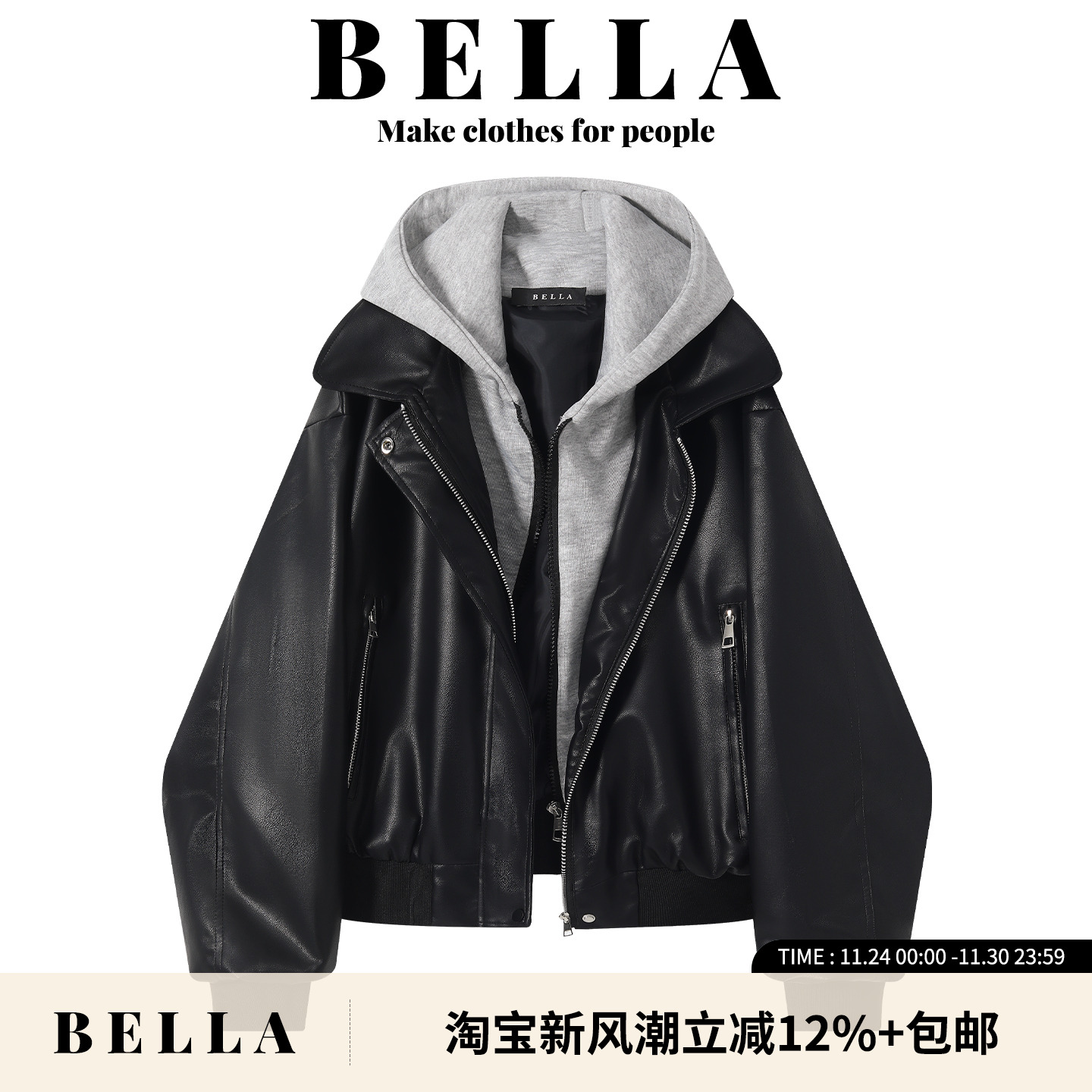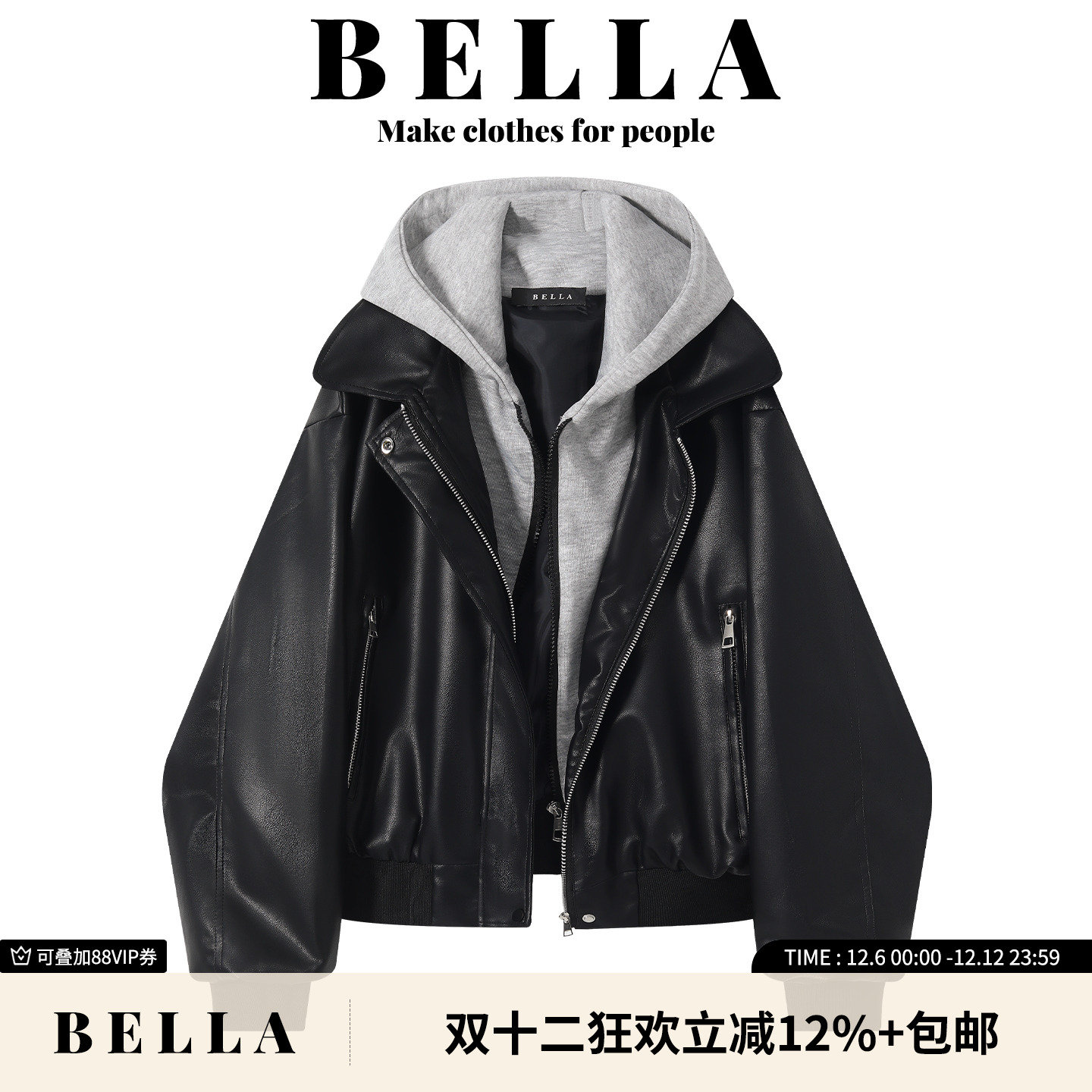 BELLA black fake two-piece hooded leather jacket women's autumn and winter retro high-end loose PU leather motorcycle jacket
