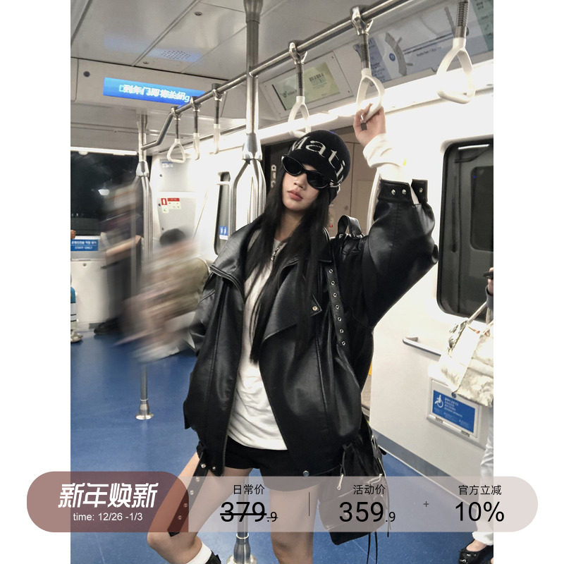 Leather jacket women's 2025 autumn new black cool sassy loose PU motorcycle American fleece thickened leather jacket