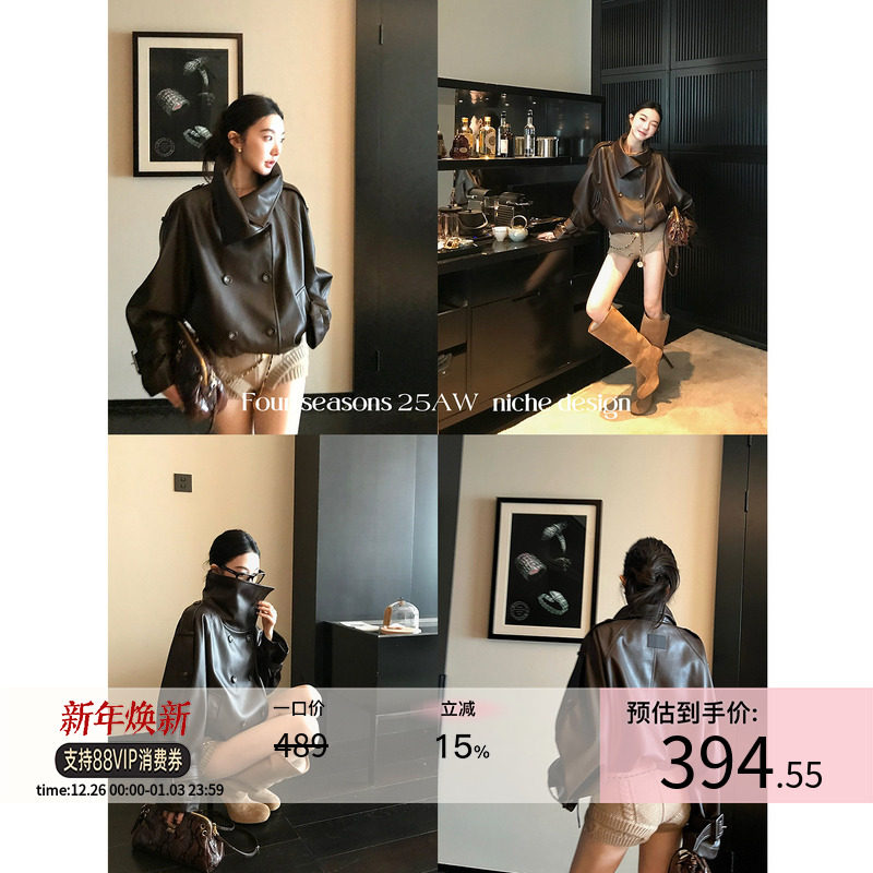 Ouyang big lapel pebble PU leather jacket women's winter high-end double-breasted retro leather jacket