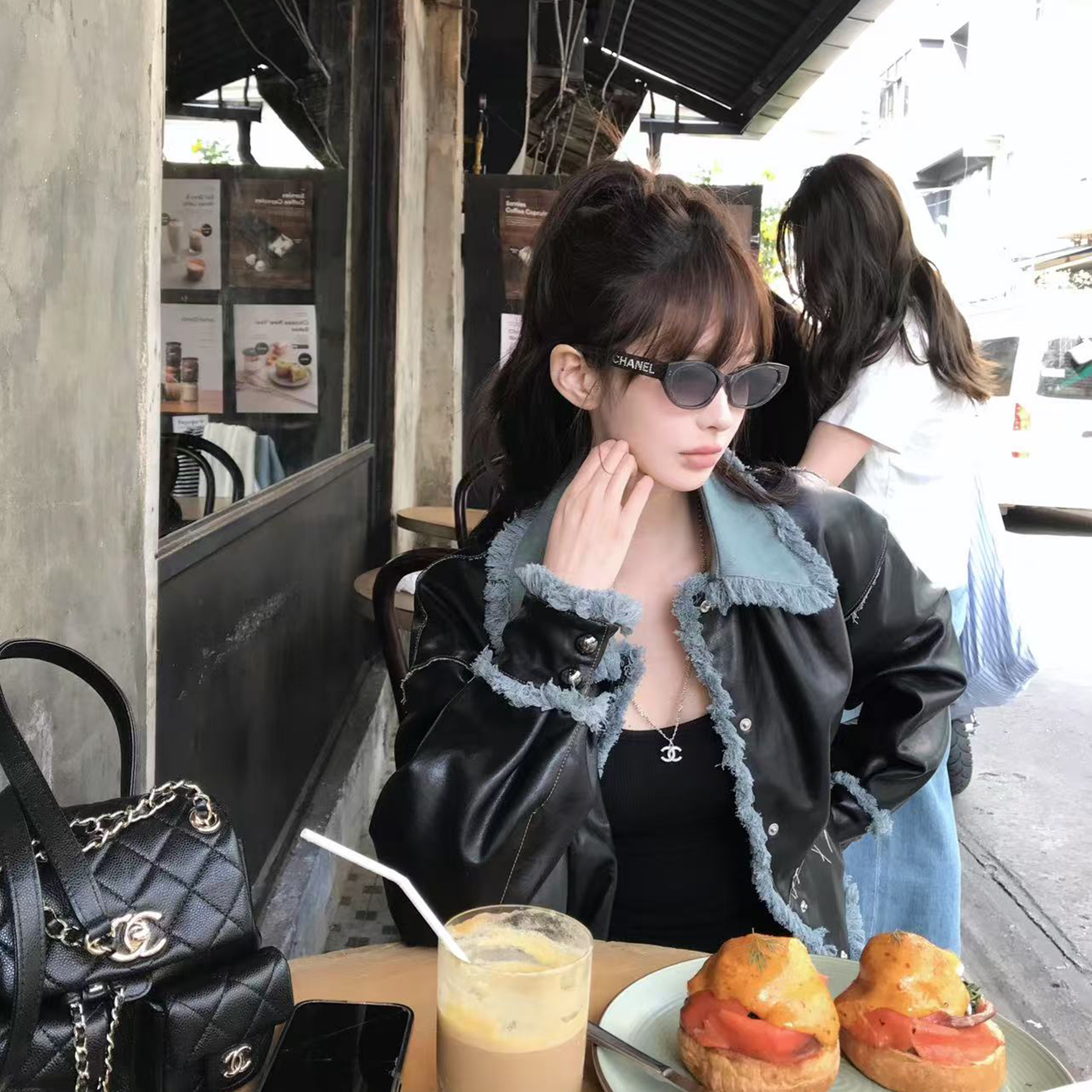 [Small quantity in stock] CHICYOU denim collar fringed edge fashionable vintage leather coat temperament small fragrance jacket