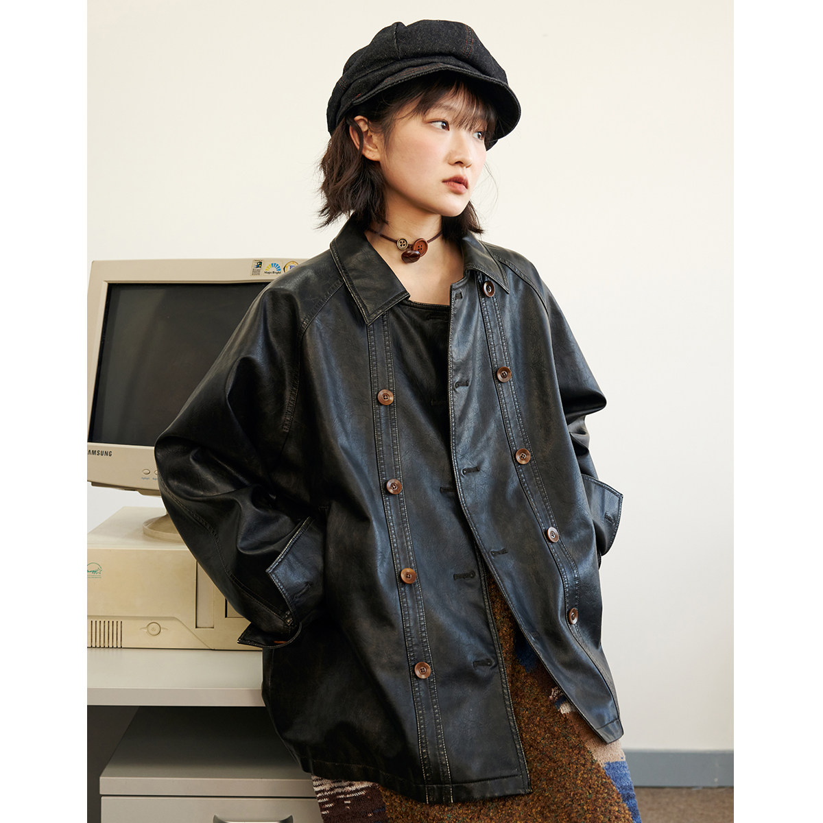 USSHEEN Wardrobe Classic Silhouette Modern Styling Slightly Broad Shoulders Loose Eco-Friendly Leather Suit Leather Jacket