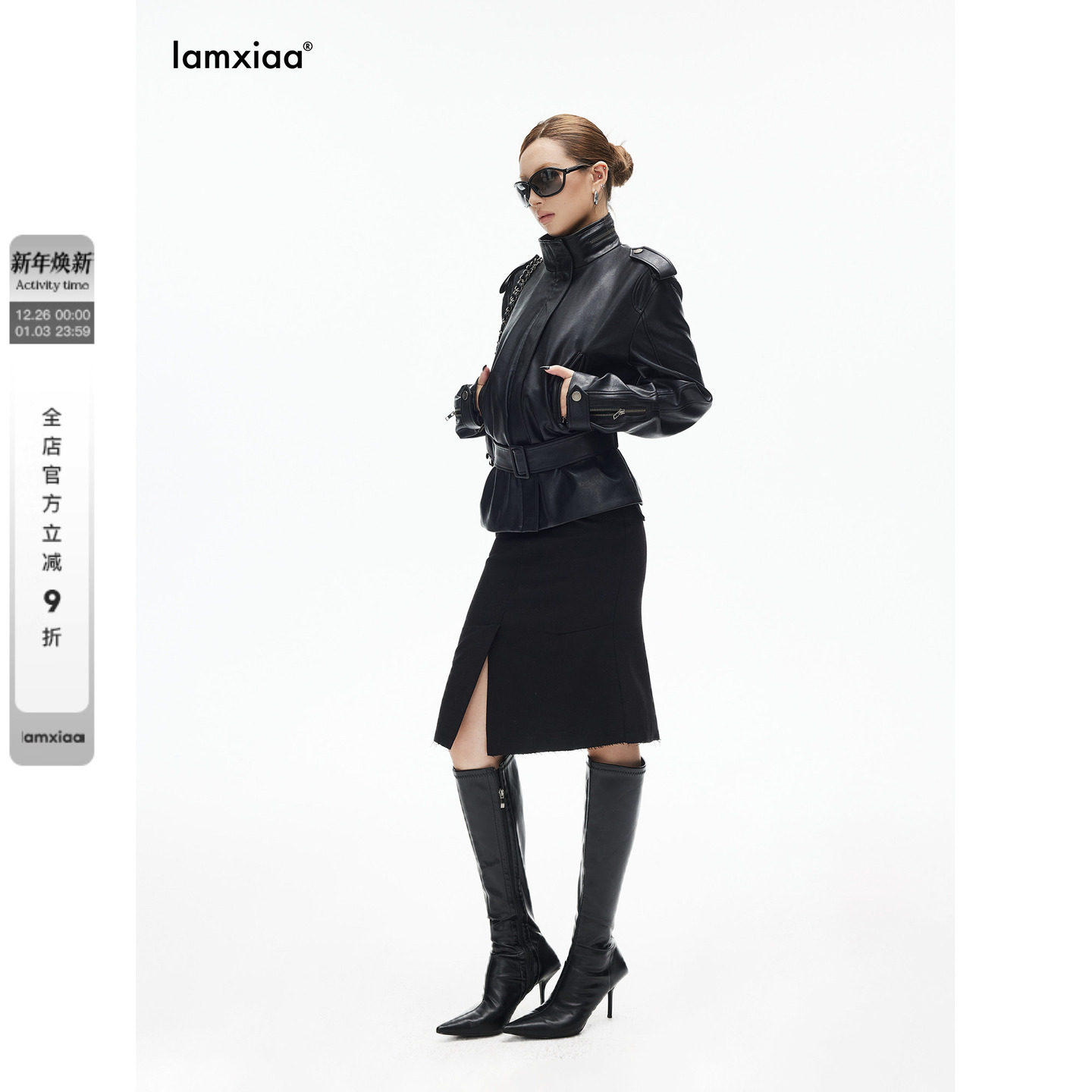 iamxiaa* Soft matte black PU leather stand-up collar epaulettes belt waist function wind short wide leather jacket