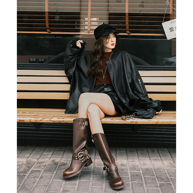 Korean GROVE leather jacket women's autumn and winter new loose retro distressed motorcycle jacket coffee jacket couple style
