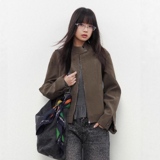 AUNP Retro Gray Green Brown Stand Up Collar Slim Leather Jacket Women's 2025 Autumn Slimming Versatile Cropped Leather Jacket