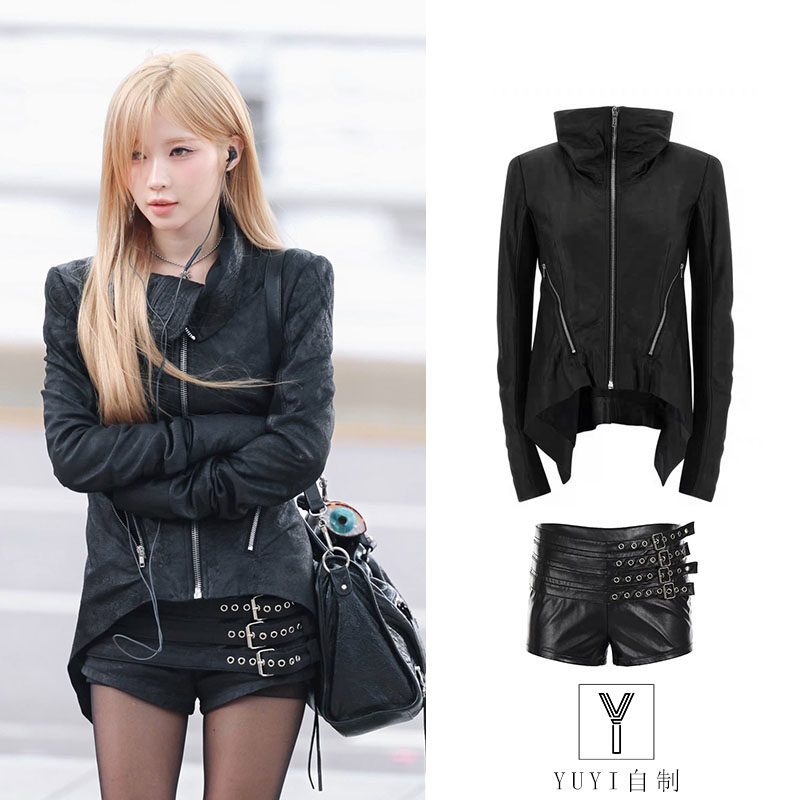 ASA same style y2k millennial hot girl black leather jacket waist slimming short jacket high-waisted shorts babymonster