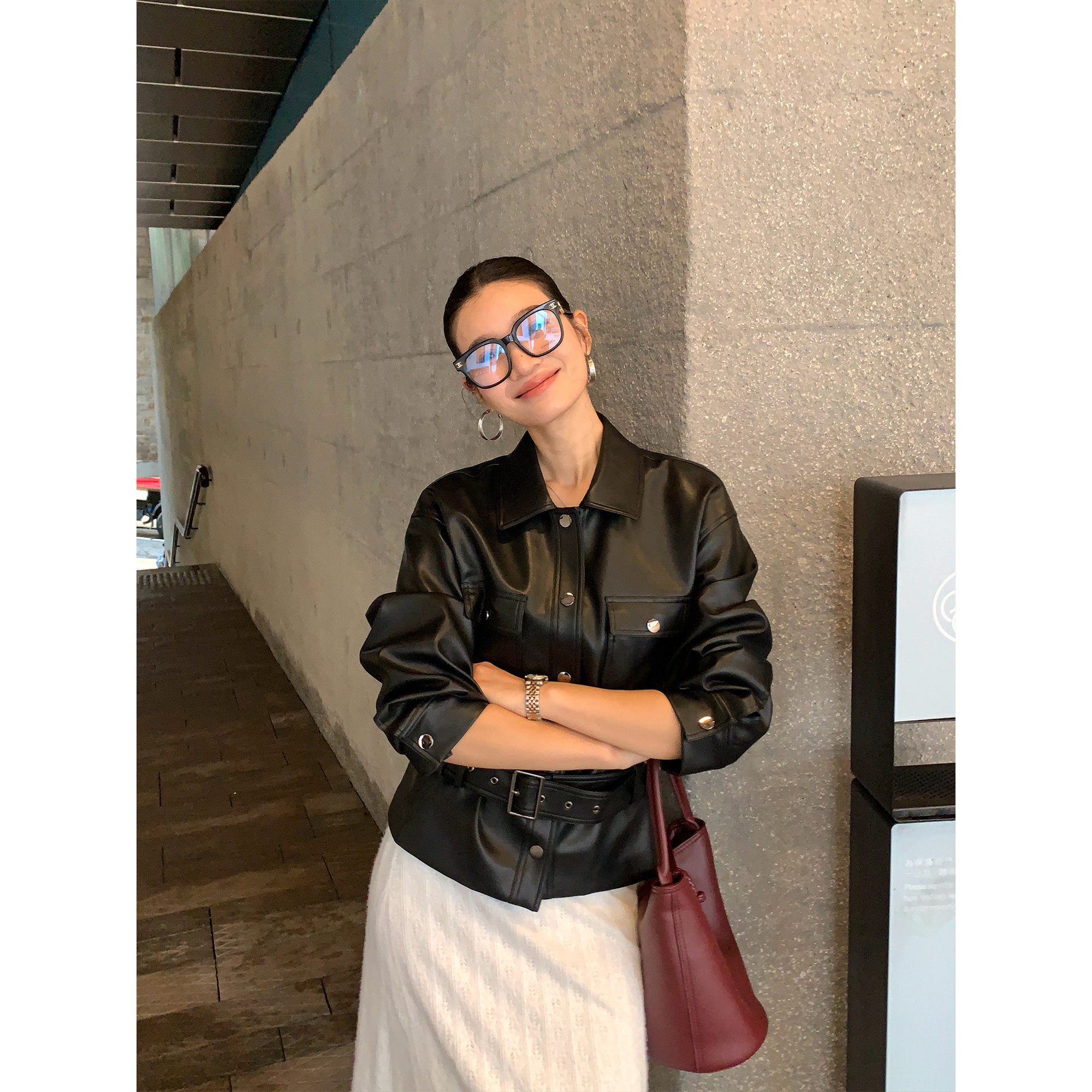 pusumede cool freeze frame black leather jacket women's design sense detachable belt PU leather cropped jacket