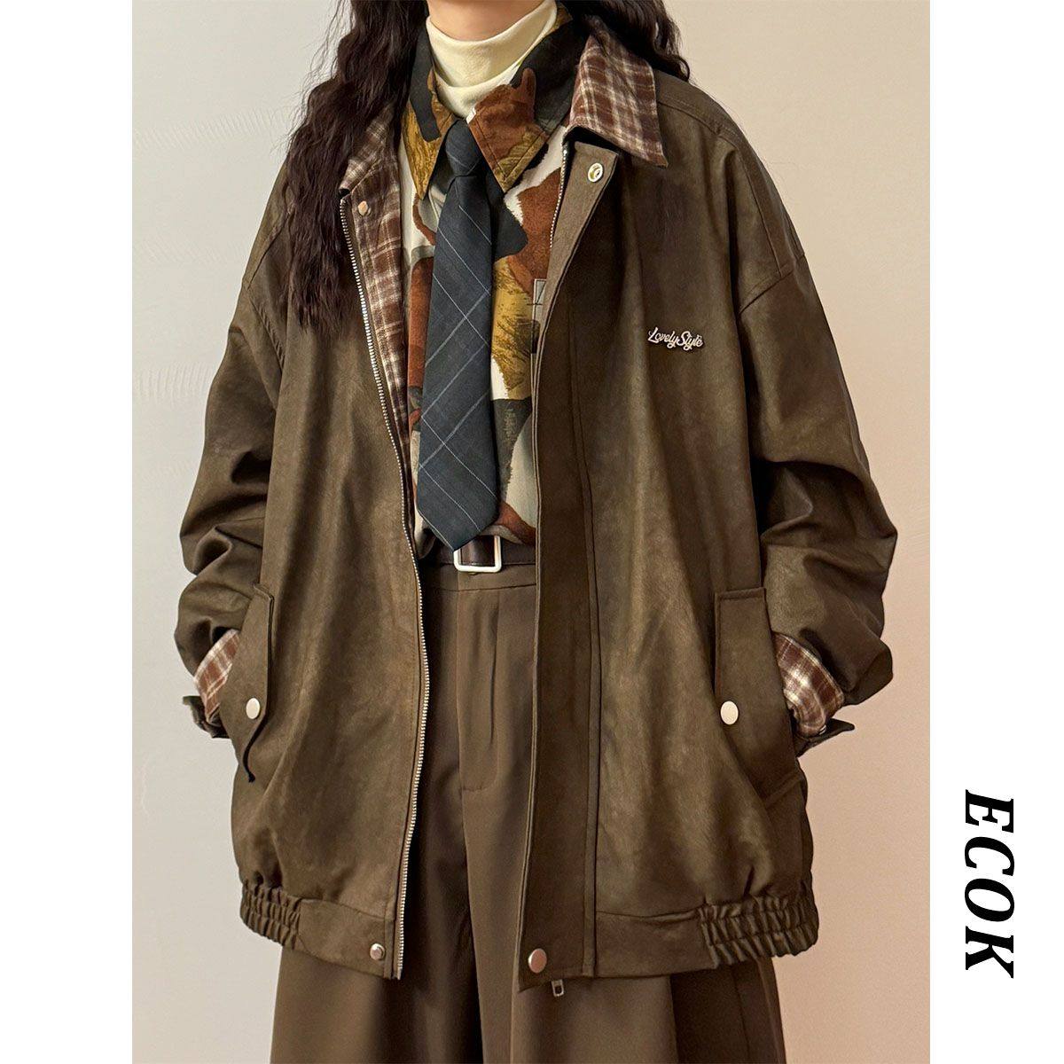 ECOK autumn American retro loose trendy brand Maillard plaid patchwork jacket street versatile leather jacket for women