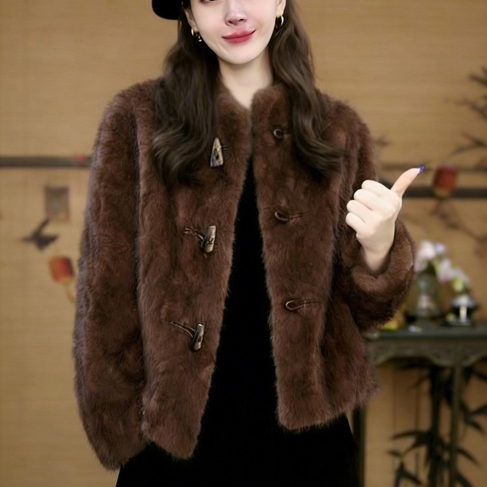 Haining short stand-up collar horn button jacket slimming temperament, autumn and winter fashion splicing light luxury