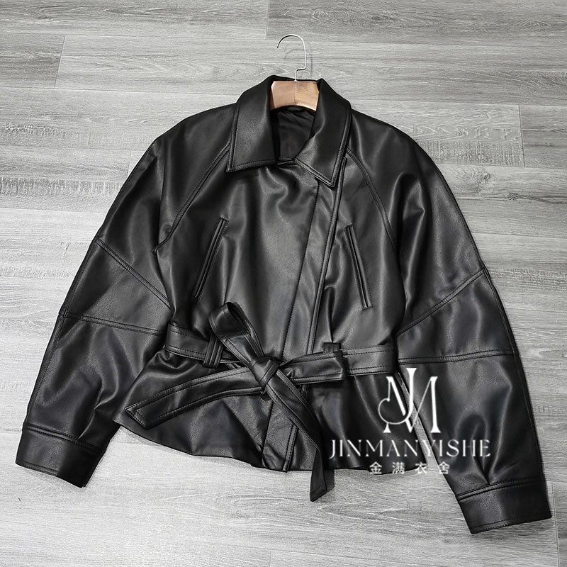 Retro motorcycle style black lace-up waist slimming short leather jacket women's high-quality raglan sleeve PU leather jacket jacket