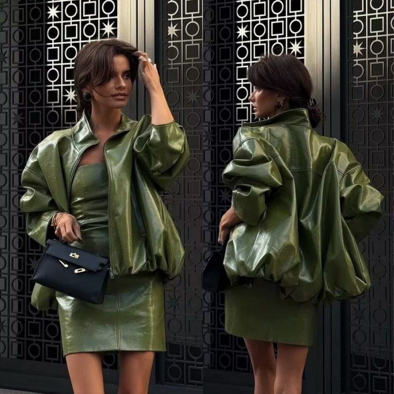 Vienna Love Letter American retro high-end atmosphere cool sassy PU leather jacket sexy slim bandeau skirt set