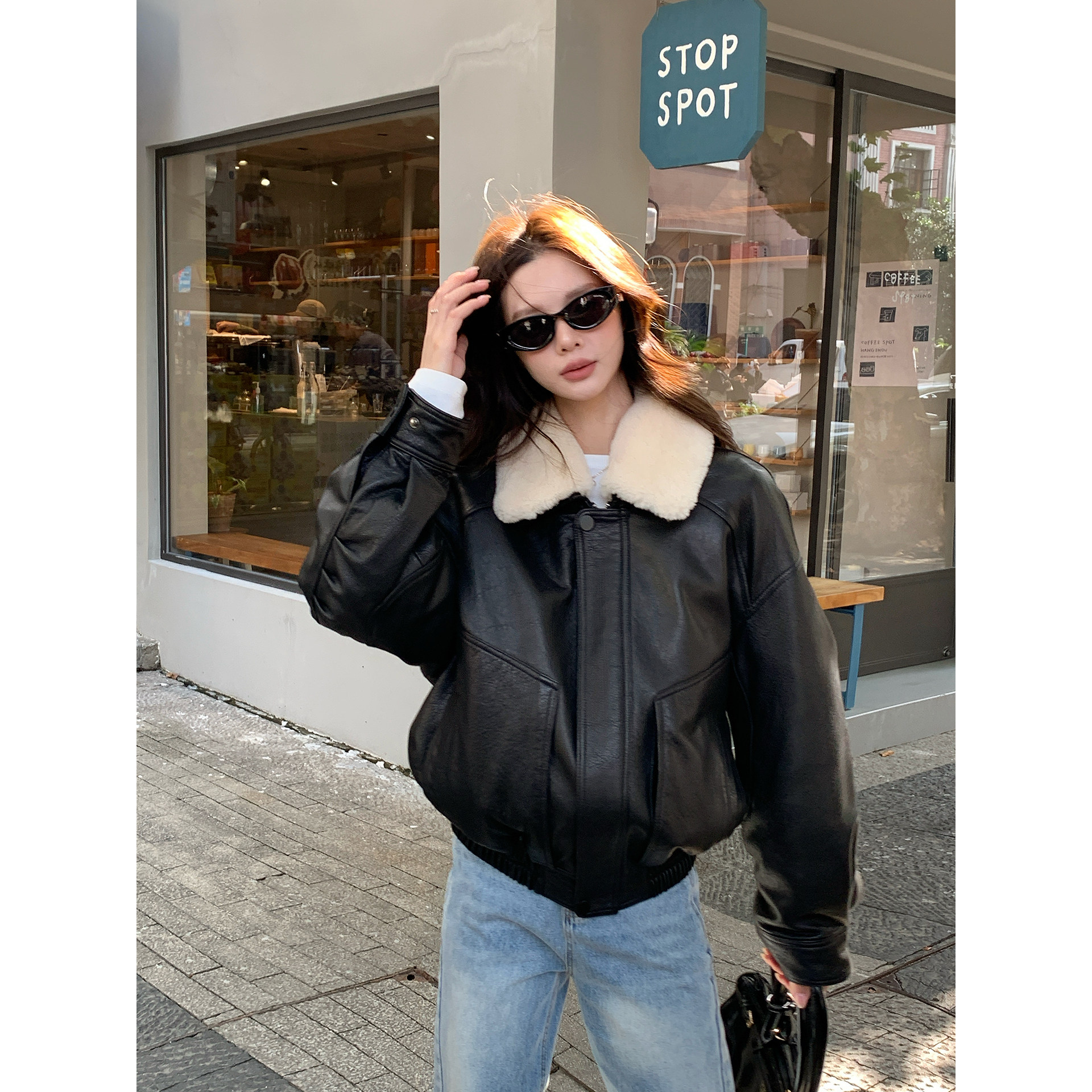 Imported bubble sheepskin leather leather jacket wool collar goose down leather down jacket thickened leather jacket women