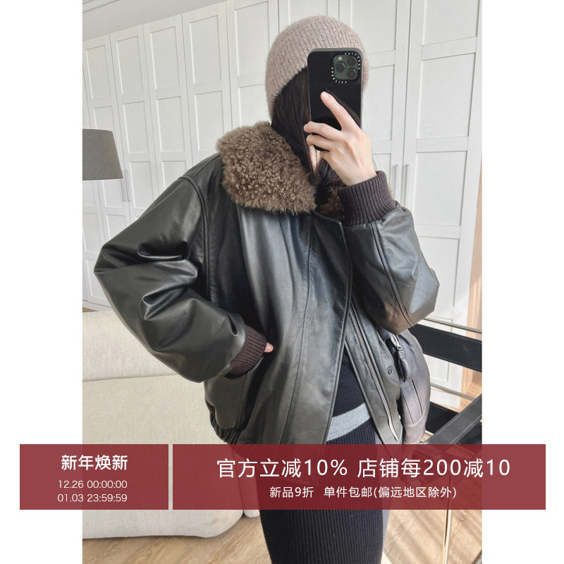 Amyy Studios JIN Calf Leather Embryo Cotton Cashmere Fur Integrated Lapel Pilot Jacket