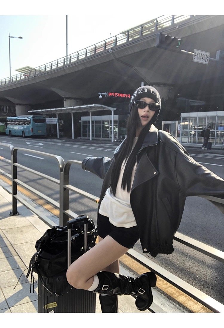 Black American retro PU leather jacket women's spring and autumn new high-end temperament loose motorcycle leather jacket leather jacket