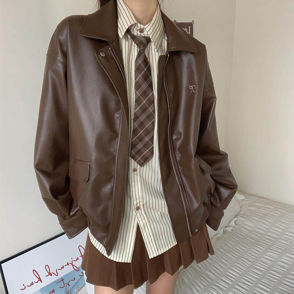 Leather jacket women's 2026 spring-and-autumn new brown cool sassy style small man early spring women's cropped jacket top