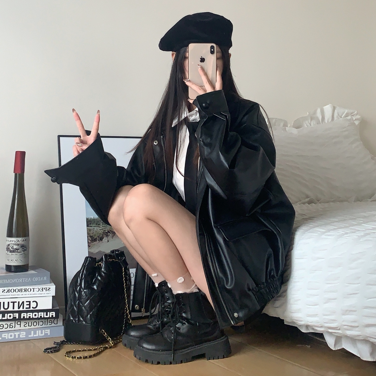 YooGirls ◆ High-quality black silhouette leather jacket leather jacket women's spring and autumn loose motorcycle suit thickened men