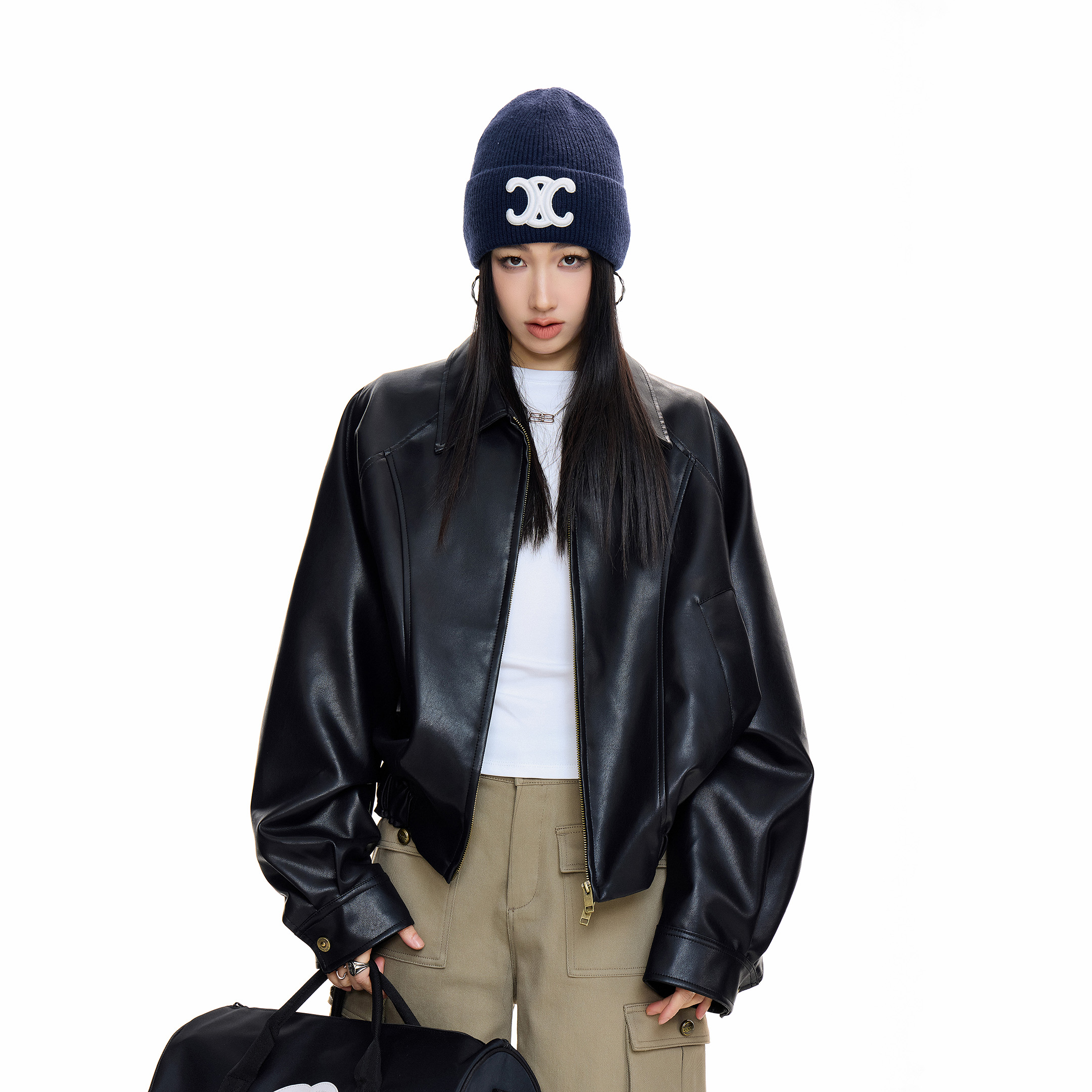 ICHMODE American Vintage Short Black Leather Jacket Women's 2025 New Fall Winter Loose Leather Jacket Top