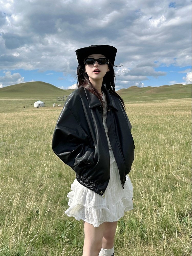 Black retro leather jacket women's 2025 spring and autumn new high-end design sense This year's popular motorcycle jacket top