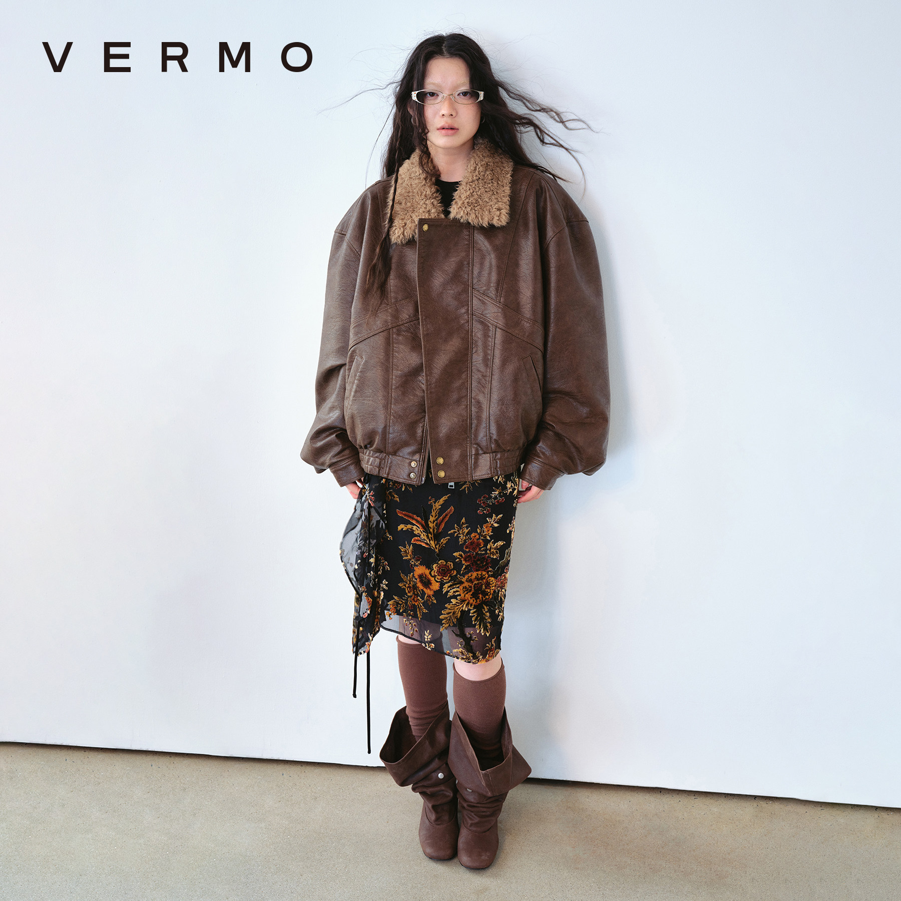 VERMO Reconstructed Vintage Quilted Wool Cotton Warm and Cozy Fur Collar Paneled Windproof Leather Jacket