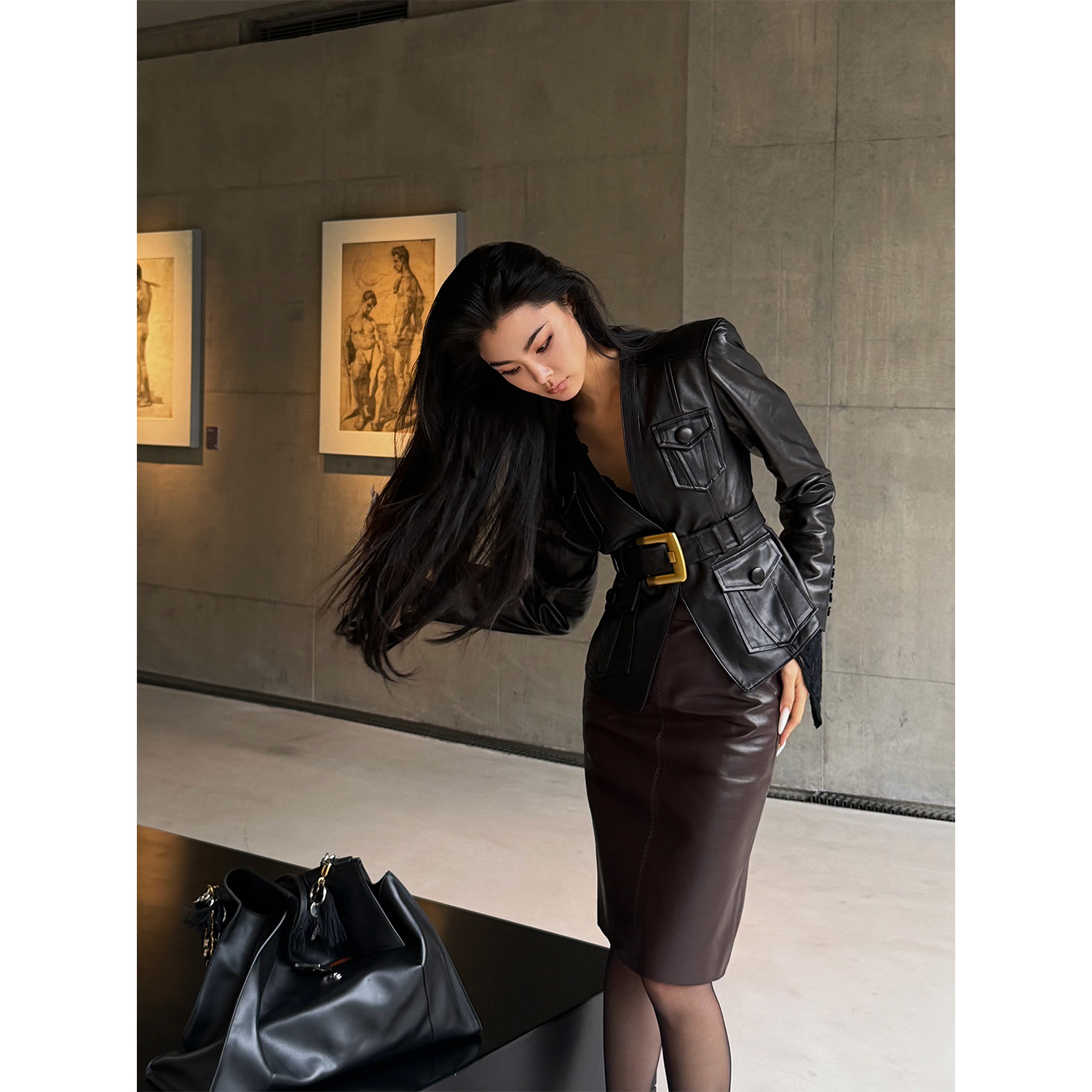 Zhao Sanguan Black Retro Waist V-Neck Leather Jacket Women's Spring 2026 New High-end Temperament Design Jacket