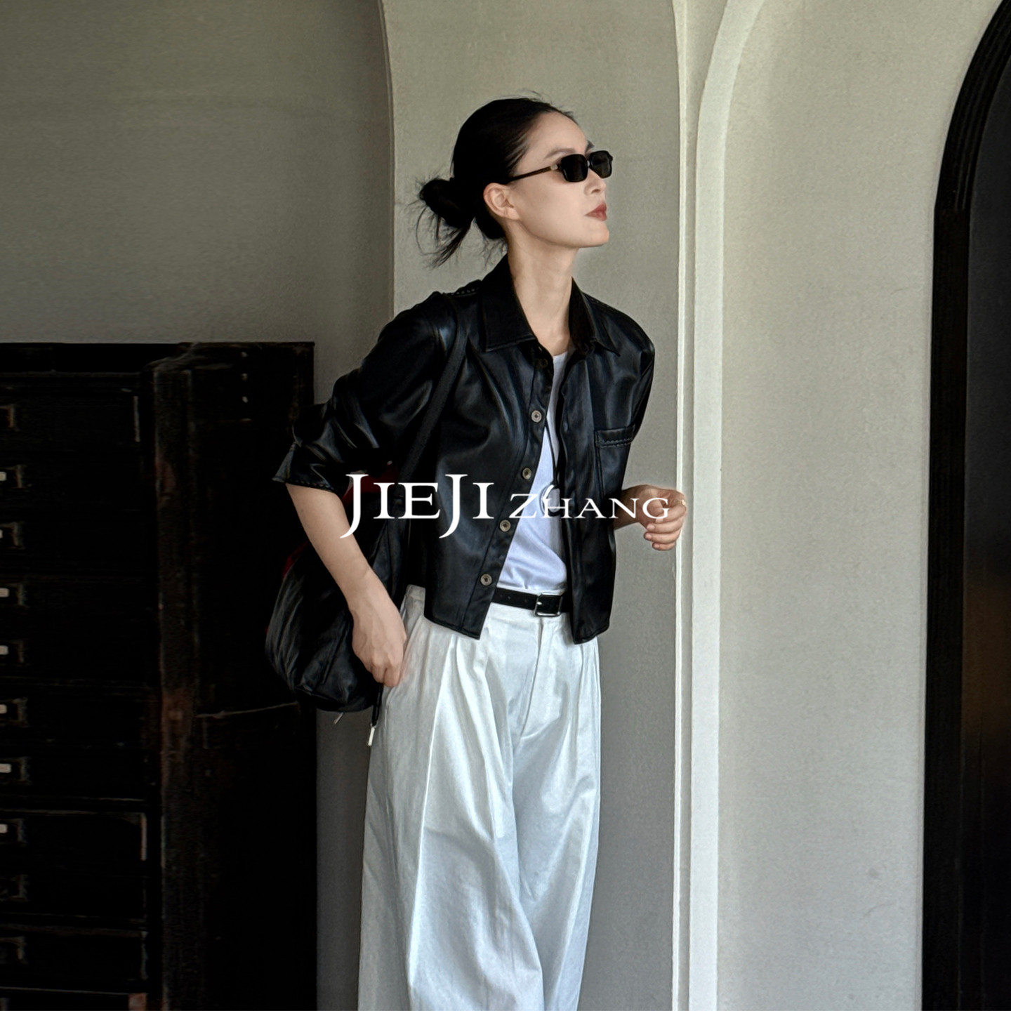 Zhang Qi JIEJI autumn retro motorcycle jacket leather jacket cropped jacket slim leather shirt top 350174
