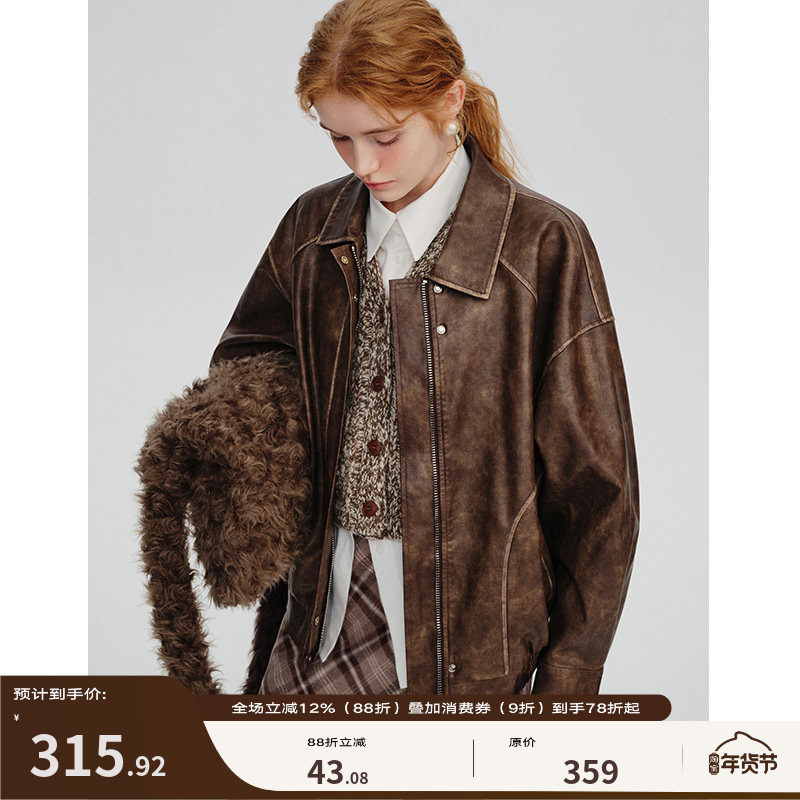 DESIGNER PLUS 2026 New Autumn Maillard Brown Leather Jacket Women's Retro Motorcycle Jacket