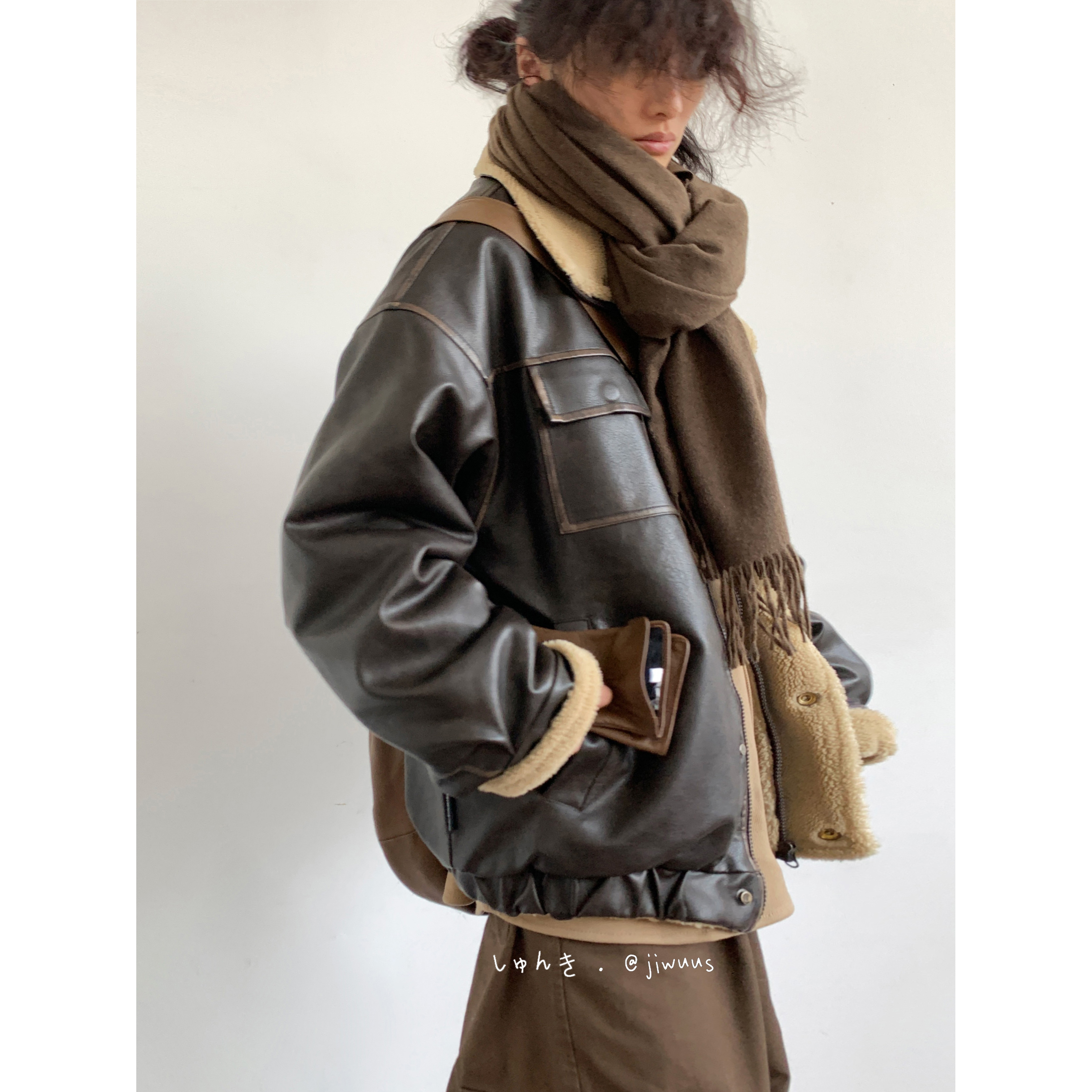 Jiwuus autumn winter Japanese vintage unisex Maillard lamb fur jacket men's and women's loose leather jacket jacket