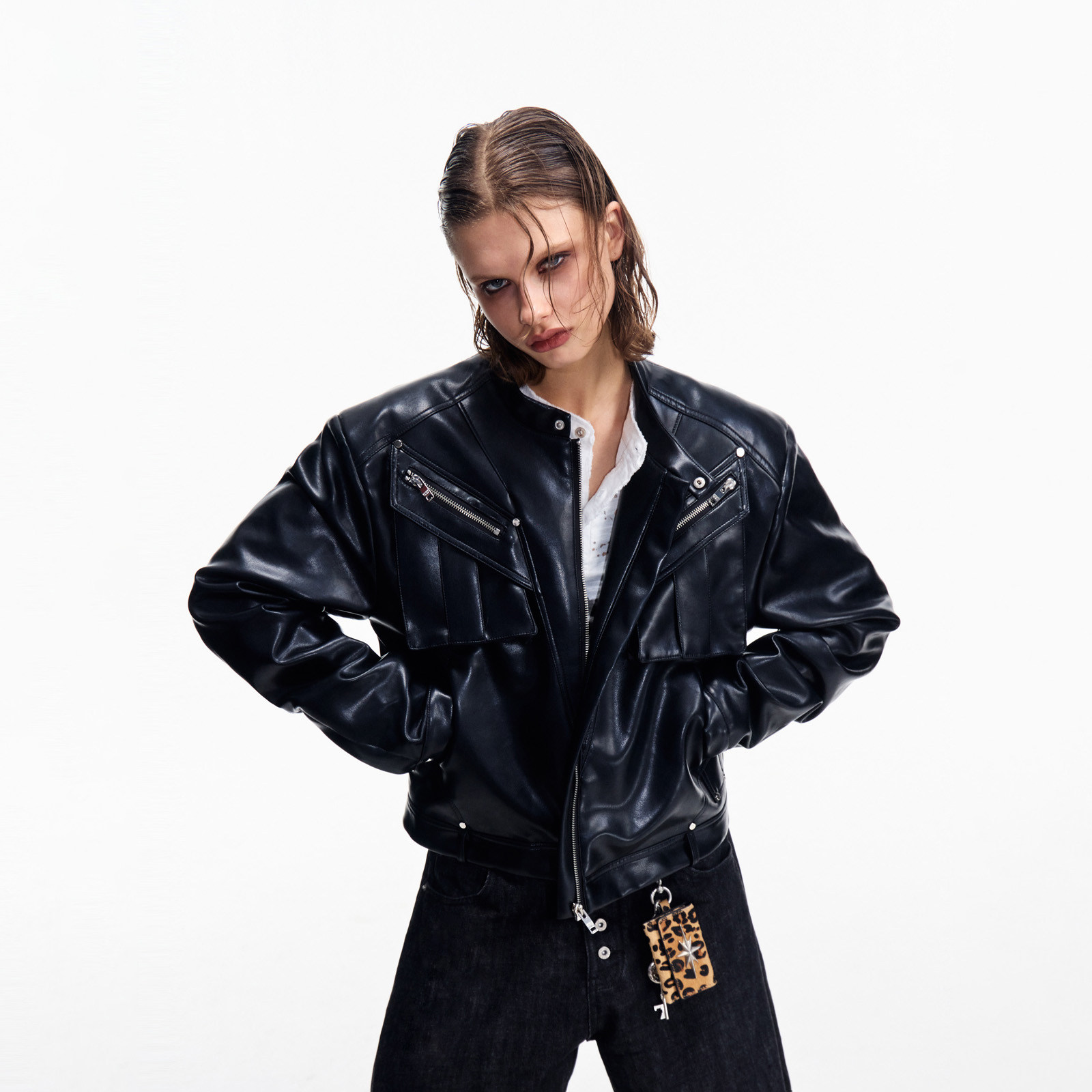 VMCL Vintage Stand Collar Venom Leather Jacket Wool Lined PU Leather Motorcycle Leather Jacket Men's 25AW vermicelli