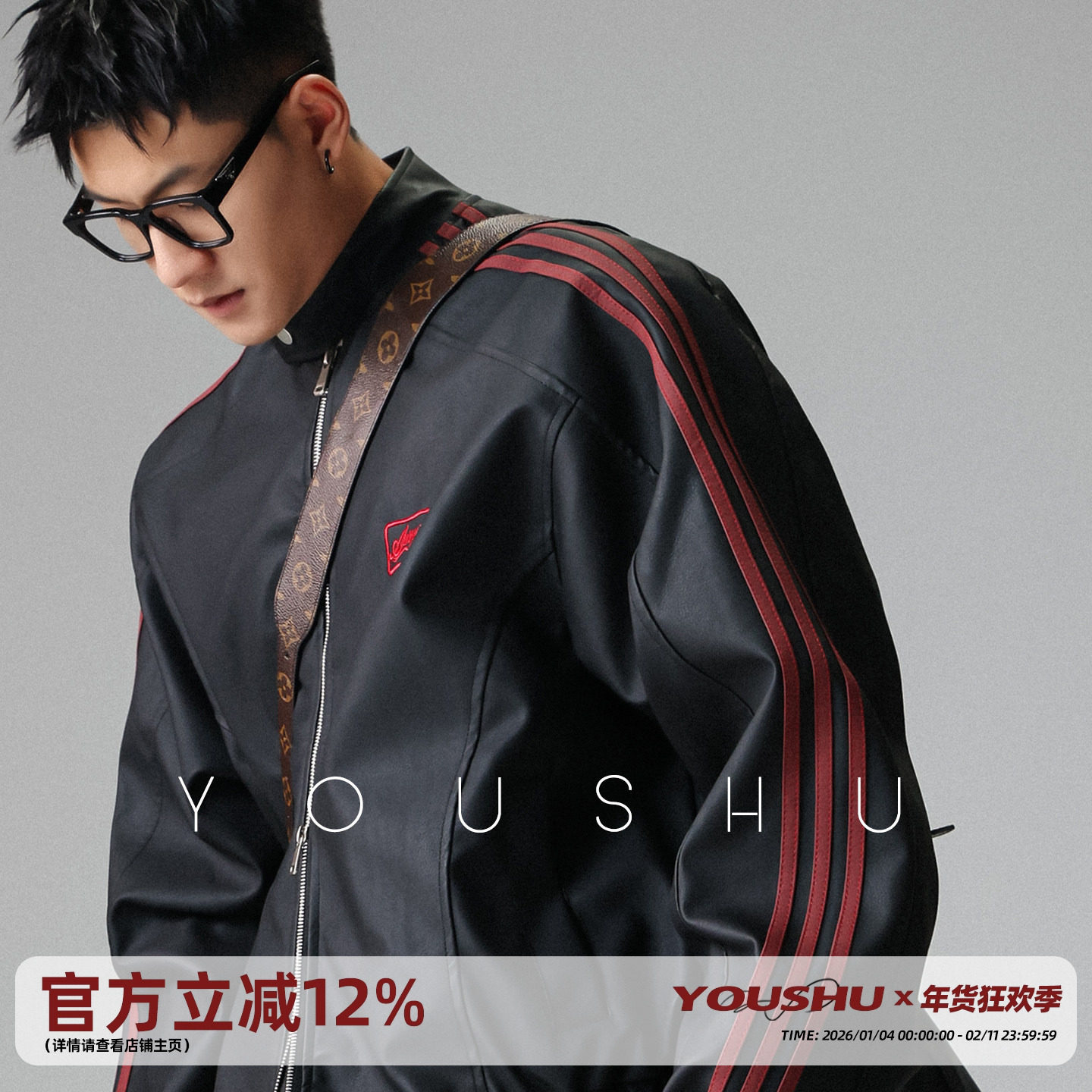 There is a "contrasting leather" stand-up collar striped motorcycle leather jacket men's spring retro American fashion jacket