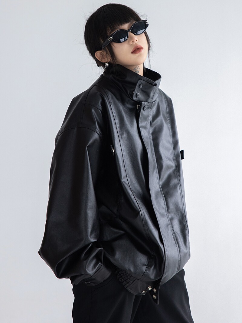 American retro trendy brand black leather jacket women's spring and autumn new high-end handsome motorcycle PU leather lapel jacket