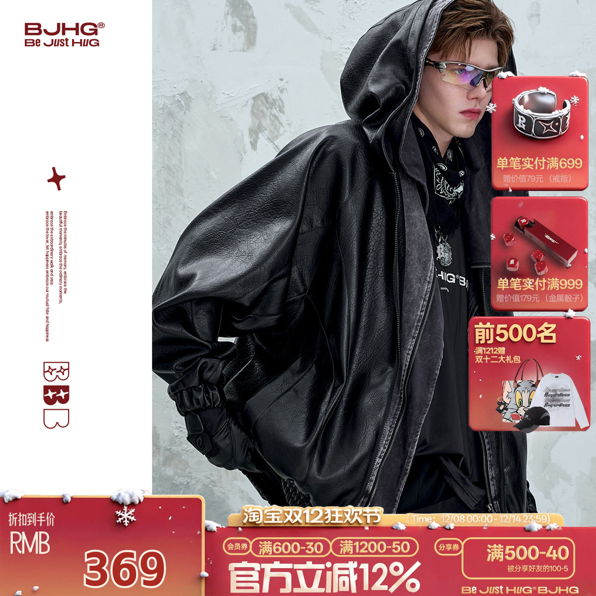 BJHG reckless retro hooded leather jacket men's autumn tide brand ruffian motorcycle suit leather jacket jacket for women