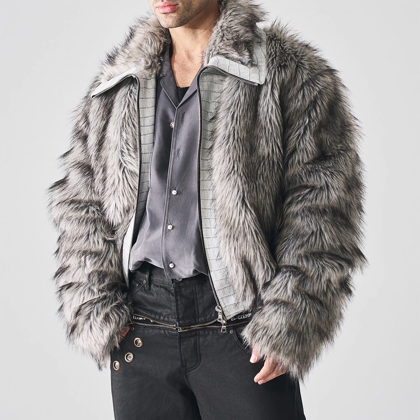 GLACIERBOY|Crocodile embossed gradient long fur leather leather patchwork silver gray wolf fur silhouette fur coat