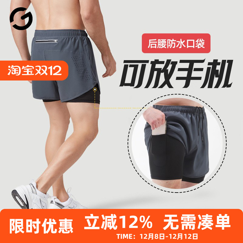 Running shorts, men's professional marathon track and field, three-point trousers, lined with double-layer pants, sports and fitness, can put mobile phones