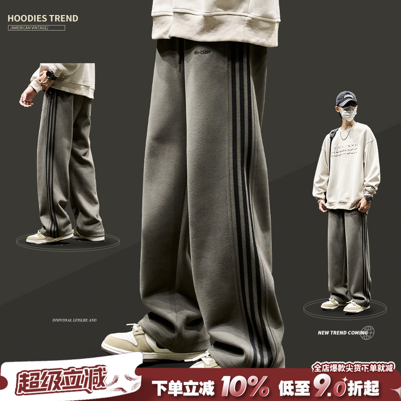Sweatpants men's 2025 new heavy fleece thickened American straight-leg pants trendy brand side striped athleisure pants autumn and winter