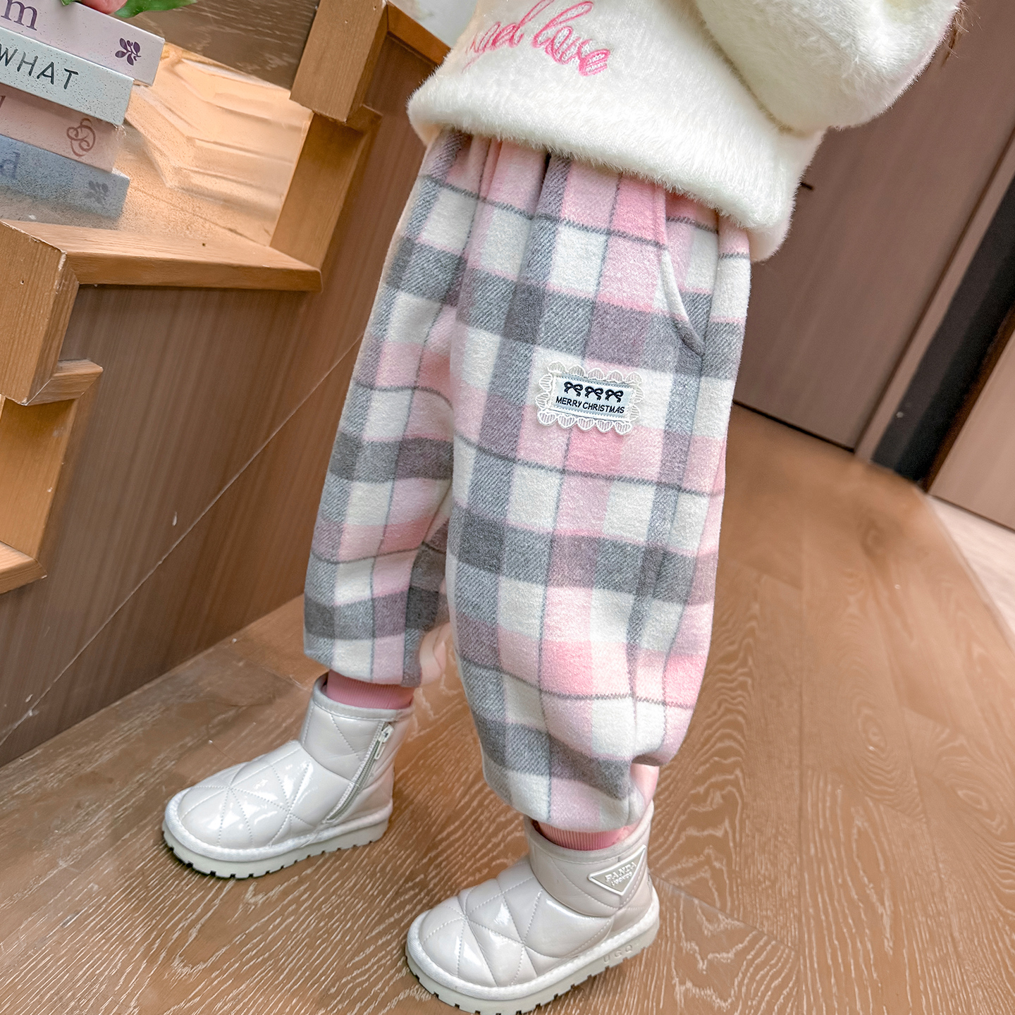 Girls' plus fleece plaid pants, autumn and winter baby girls, warm trousers, winter clothes, children's integrated velvet slacks