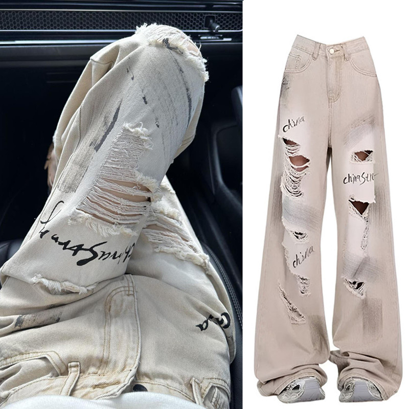 American retro khaki graffiti ripped jeans women's new summer high-waisted loose slimming floor-length trousers