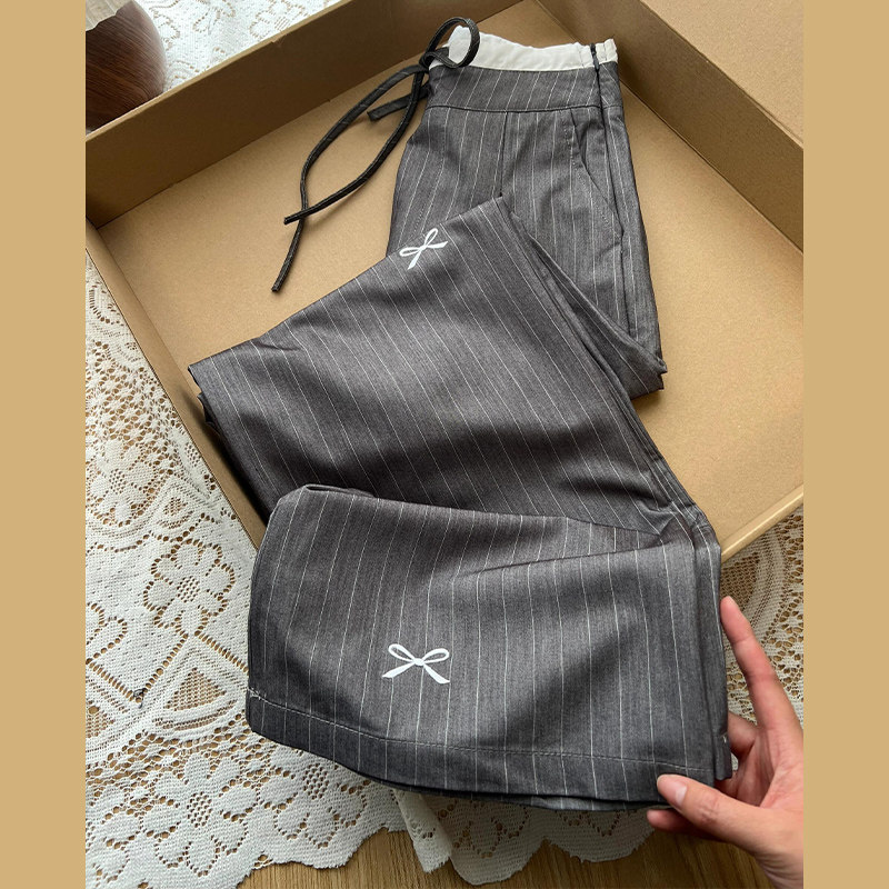 SUN Korean version of gray vertical striped suit pants women's spring 2025 fake two-piece bow embroidered casual trousers