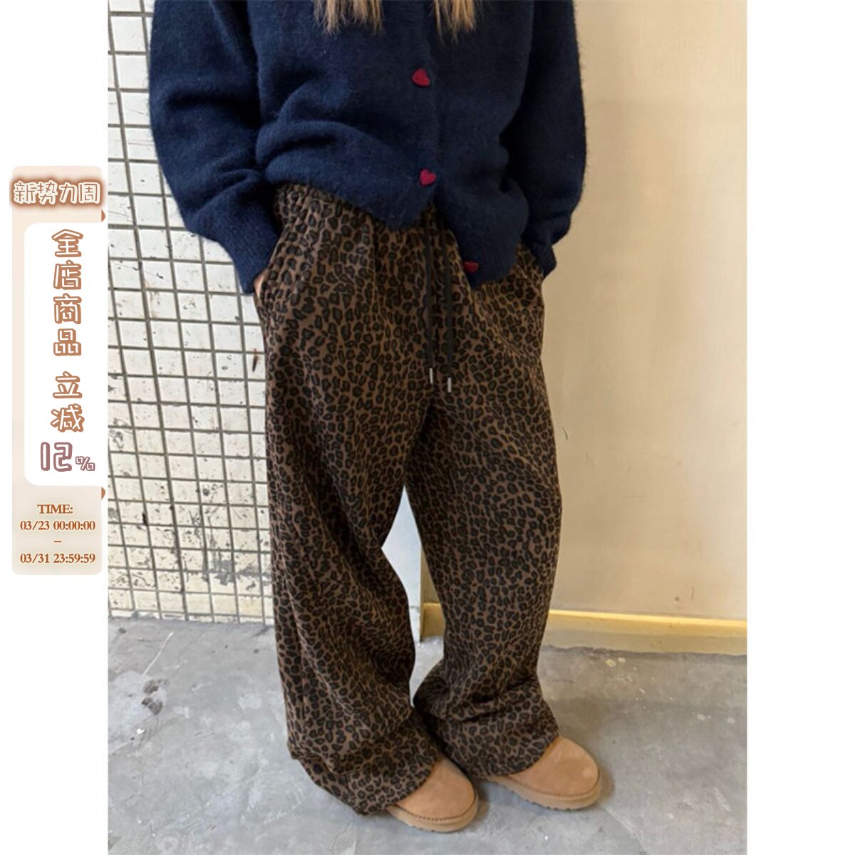 Kawagawa Yajia Maillard plush leopard print sweatpants for men and women, new winter elastic waist loose casual trousers drawstring