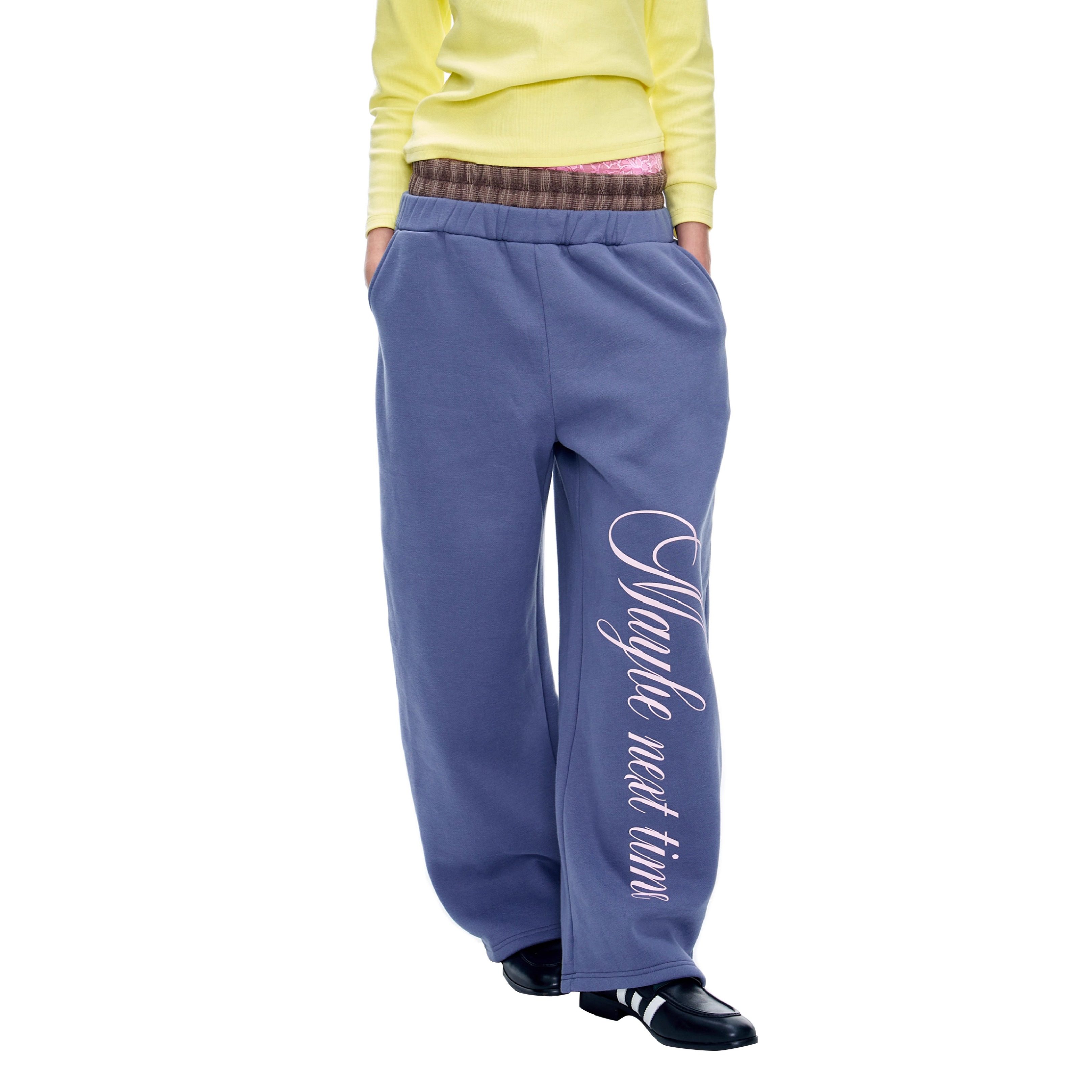 Maybe next time Fake 3-layer waistband paneled lace contrast print scimitar fleece sweatpants blue/black