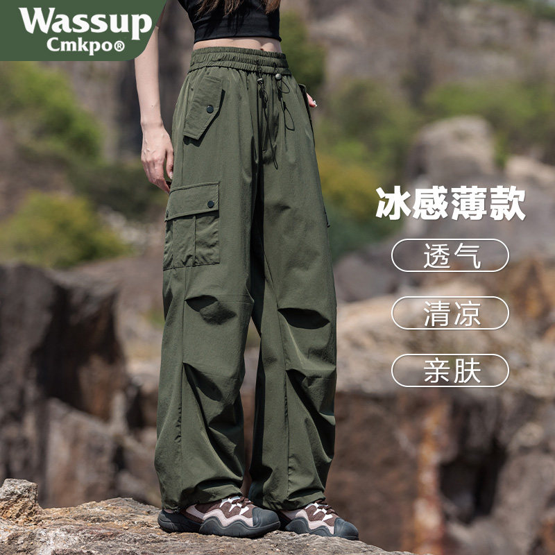 WASSUP CMKPO American Ice Silk Cargo Pants for Men and Women 2025 New Lightweight and Quick-Drying Loose Athleisure Pants