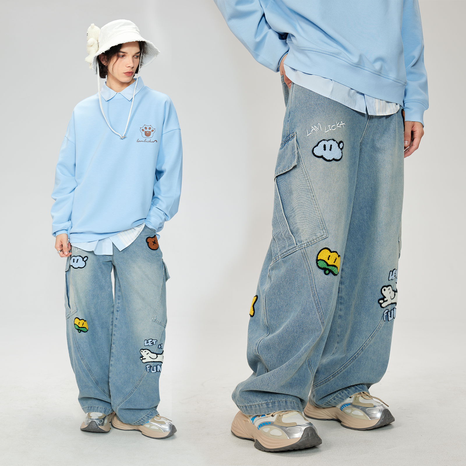Zhou Shen's same LAMLICKA puppy American large pocket scimitar pants men's wash drape loose denim wide-leg pants