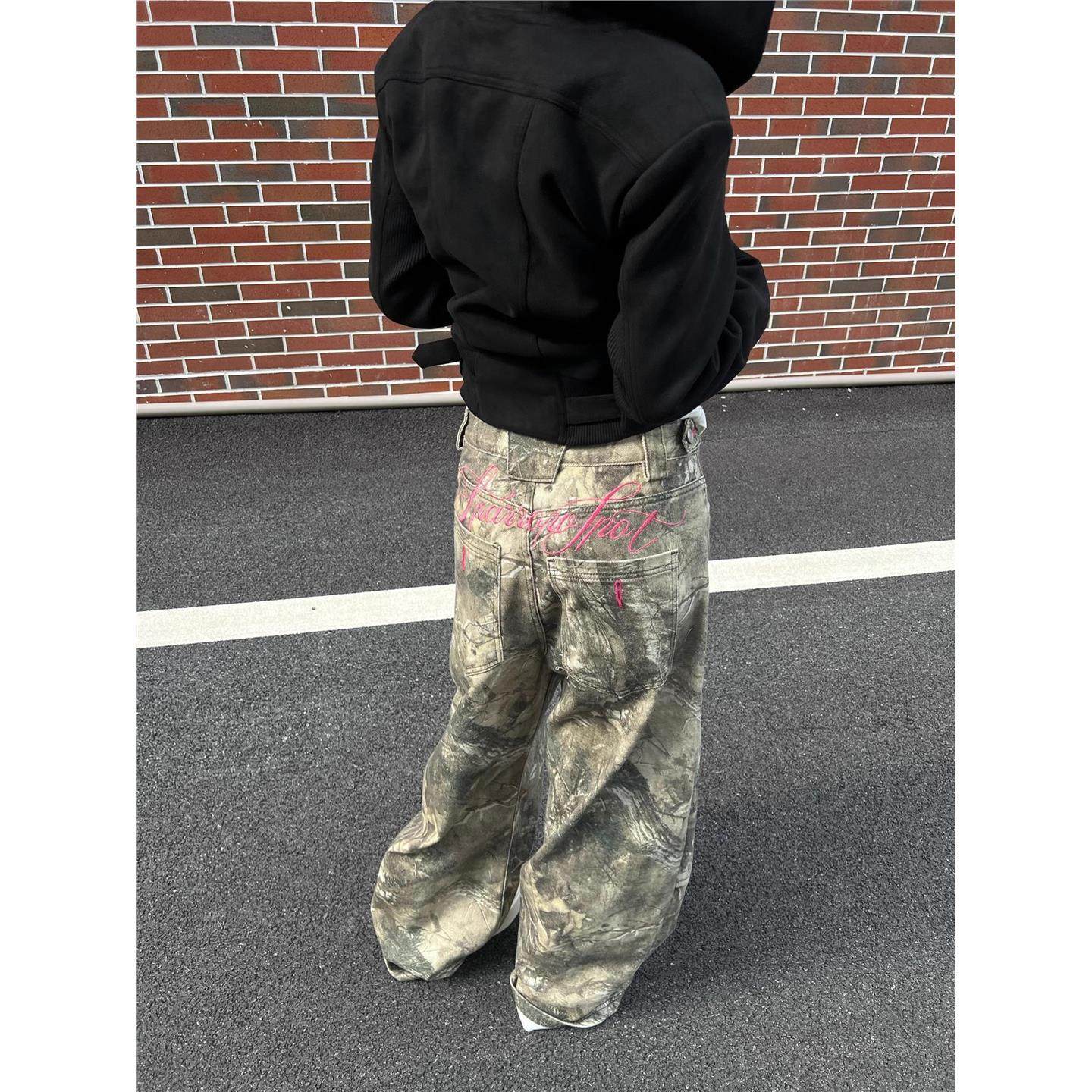 American vintage washed old letter embroidery twig camouflage jeans men's and women's versatile workwear wide-leg library